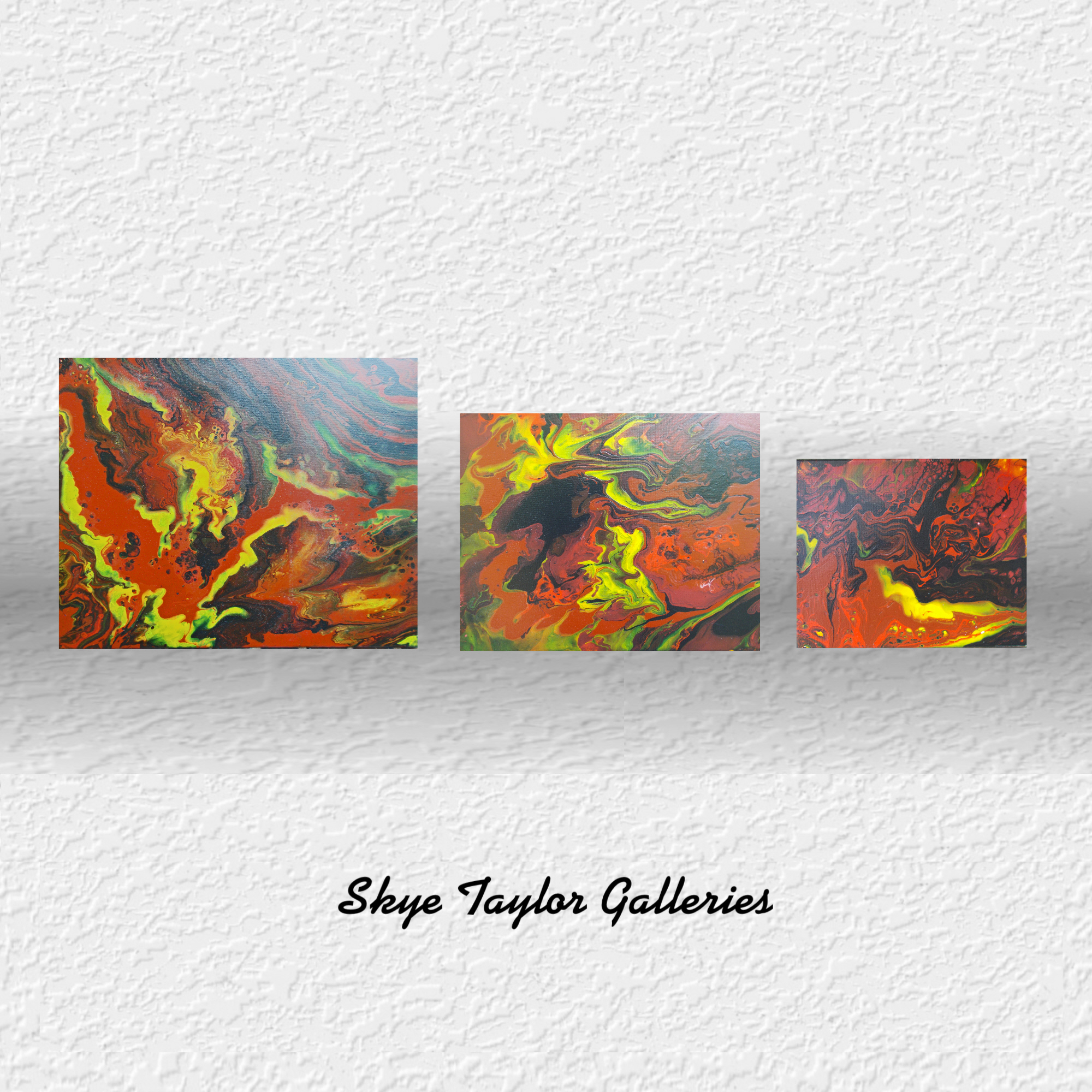 Unleash the bold energy of contemporary expression with this captivating 3-piece Red Abstract Triptych by renowned artist Skye Taylor. This collection of assorted-size pour paintings commands attention with fiery reds, molten oranges, electric yellows, and deep blacks—all fluidly dancing across each canvas in a vivid, dynamic display. Taylor’s signature technique of acrylic pouring allows colors to merge organically, creating depth and movement that shifts with the light. Perfect for modern interiors or bold, eclectic spaces, this triptych brings both warmth and powerful emotion to any wall it graces.